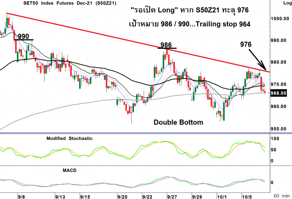 - “รอเปิด Long” หาก S50Z21 ทะลุ 976 S50Z21 ขึ้นทดสอบยังไม่ผ่านแนวกด Downtrend Line ในกราฟรายชั่วโมง ทะลุได้จะเป็นจังหวะ Follow Buy…ต่างชาติ Short -10,618 สัญญา…เปิด Long หากทะลุ 976 เป้าหมาย 986 / 990..Trailing Stop ที่ 964