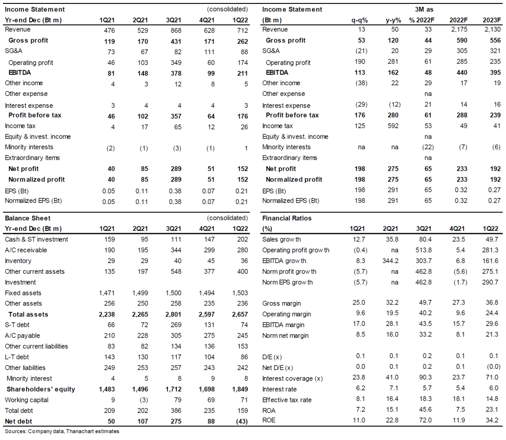 - อัตรากำไรจากการดำเนินงานเพิ่มขึ้นเป็น 24.4% ใน 1Q22 จาก 9.6% ใน 1Q21 และ 9.6% ใน 4Q21 เนื่องมาจากการเติบโตของรายได้ที่แข็งแกร่งและผลประโยชน์จาก operating leverage