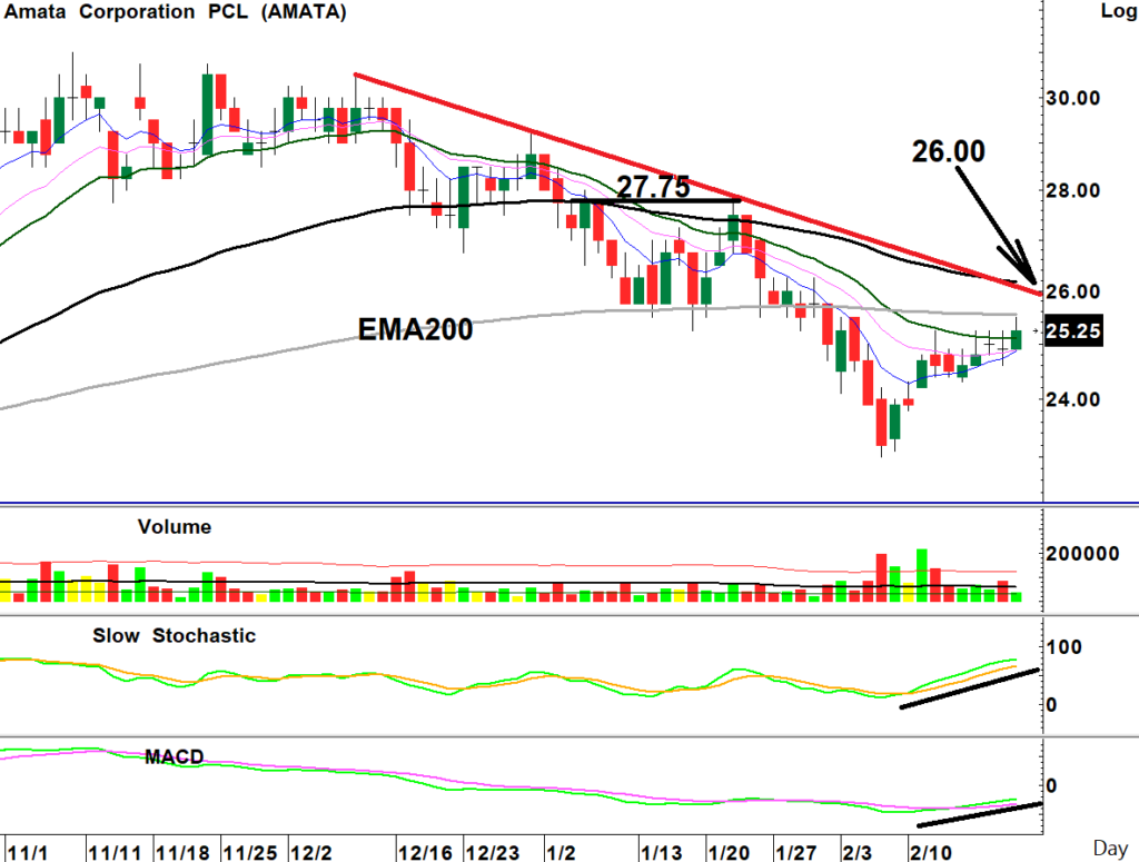 สถานะซื้อเพิ่ม: ราคาหุ้นกลับตัวขึ้นเหนือ EMA200วัน ทดสอบแนวกด Downtrend Line ระยะกลาง พร้อมปริมาณการซื้อขายสูง ขณะที่เกิดสัญญาณซื้อทั้งใน Stochastic และ MACD พลิกเป็นบวกสนับสนุนการกลับตัว มีโอกาสยกฐานขึ้นต่อ เป็นจังหวะซื้อเก็งกำไร