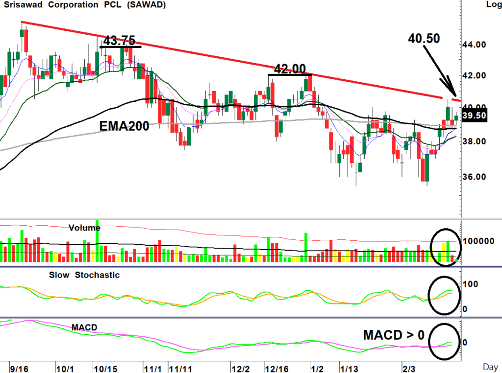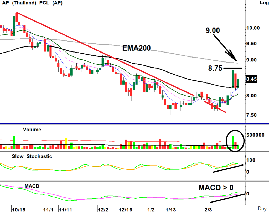 สถานะซื้อเพิ่ม: ราคาหุ้นยกฐานขึ้นต่อหลังเปิด Gap ทะลุแนว Downtrend Line ยืนเหนือค่าเฉลี่ย 3 เดือนได้ พร้อมปริมาณการซื้อขายสูงยืนยันการ Breakout ขณะที่เกิดสัญญาณซื้อจาก MACD พลิกเป็นบวกและเริ่มเกิด Golden Cross เป็นจังหวะซื้อเก็งกำไร