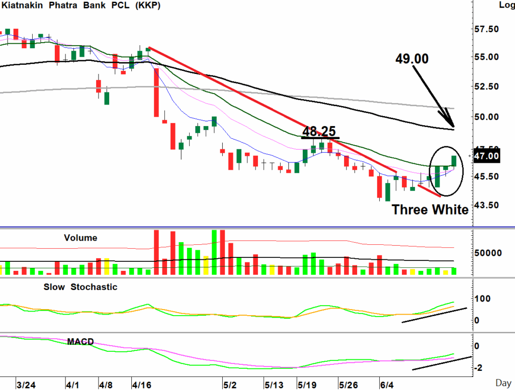 สถานะเริ่มสะสม: ราคาหุ้นฟื้นตัวยกฐานขึ้นกลับมายืนเหนือแนวเส้นค่าเฉลี่ย 1 เดือนได้ ด้วยแท่งเทียน Three White Soldiers ขณะที่เกิดสัญญาณซื้อจาก Stochastic ขึ้นรอบใหม่และ MACD ฟื้นมาชี้ตัด Signal ขึ้นมีแนวโน้มพลิกเป็นบวก เป็นจังหวะซื้อเก็งกำไร