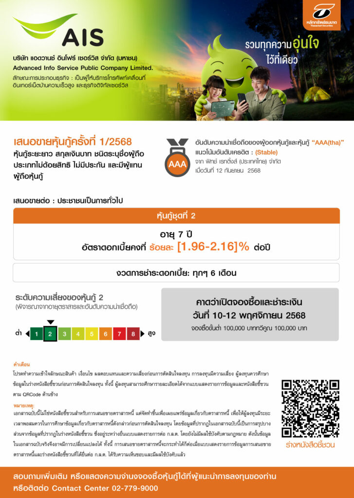 บล. ธนชาต เสนอขายหุ้นกู้ ADVANC ครั้งที่ 1/2568