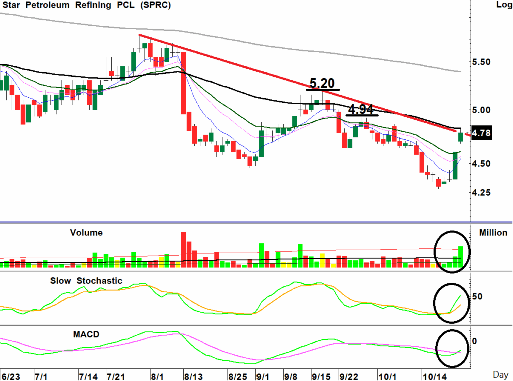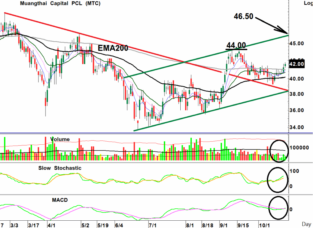 สถานะเริ่มสะสม: ราคาหุ้นกลับตัวขึ้นทะลุแนวกด Downtrend Line พร้อมปริมาณการซื้อขายสูงยืนยันการ Breakout ขณะที่เกิดสัญญาณซื้อจาก Stochastic ขึ้นได้รอบใหม่ในโซนต่ำและ MACD ฟื้นมาชี้ตัด Signal ขึ้นสนับสนุนการกลับตัว เป็นจังหวะซื้อเก็งกำไร