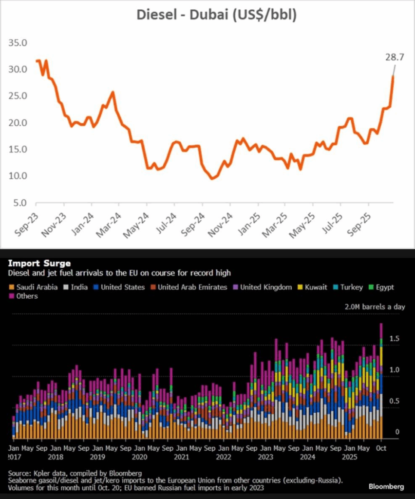 - ยุโรปได้มีการนำเข้าดีเซลและน้ำมันเครื่องบินเพิ่มขึ้นสูงสุดทำ record high เพื่อสำรองเชื้อเพลิงในฤดูหนาวและหลีกเลี่ยงซื้อน้ำมันจากรัสเซีย