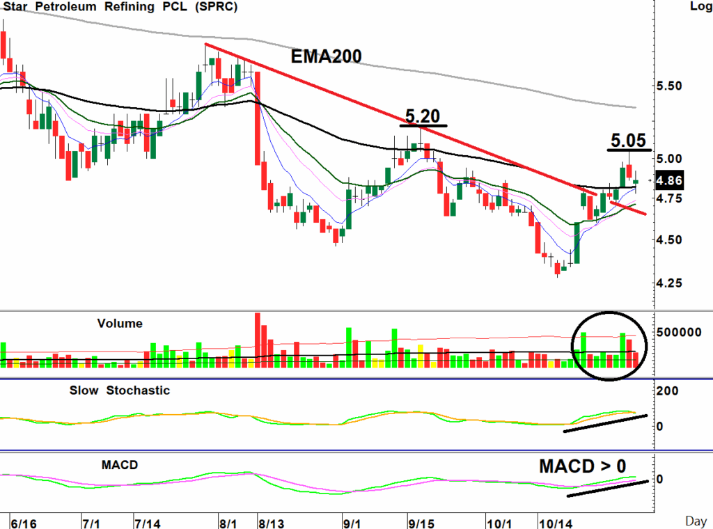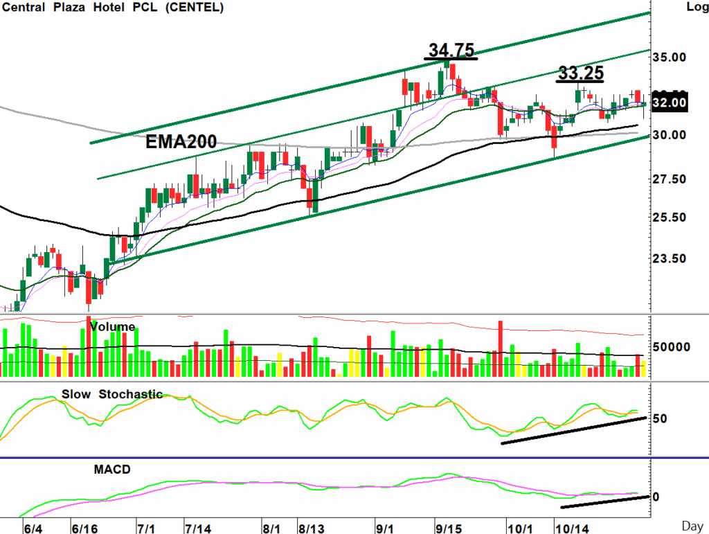 สถานะซื้อเพิ่ม: ราคาหุ้นกลับตัวขึ้นทะลุแนวกด Downtrend Line กลับยืนเหนือค่าเฉลี่ย 3 เดือน พร้อมปริมาณการซื้อขายหนาแน่น ขณะที่เกิดสัญญาณซื้อจาก Stochastic รอบใหม่ในโซนต่ำและ MACDพลิกเป็นบวกชี้ขึ้น มีโอกาสฟื้นขึ้นต่อ เป็นจังหวะซื้อเก็งกำไร