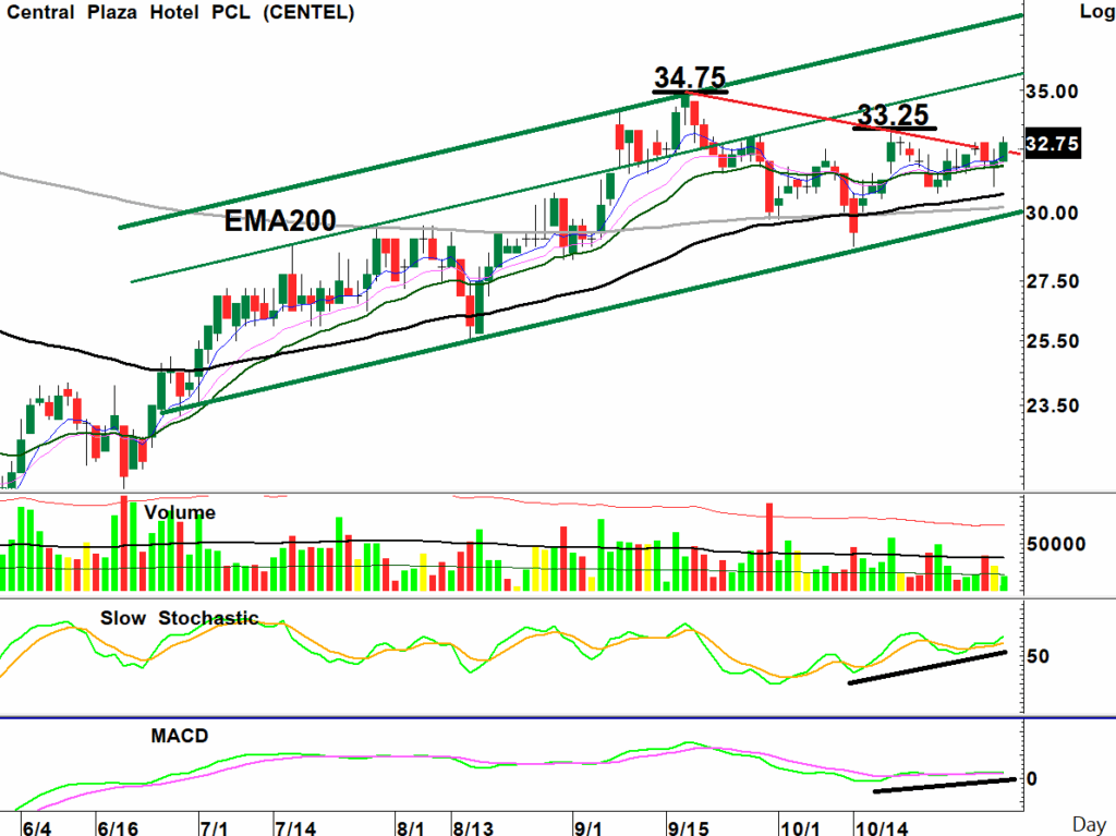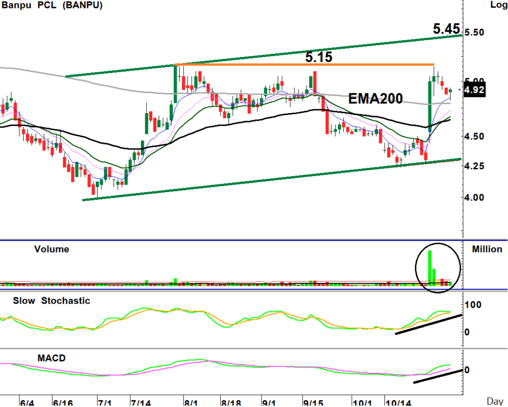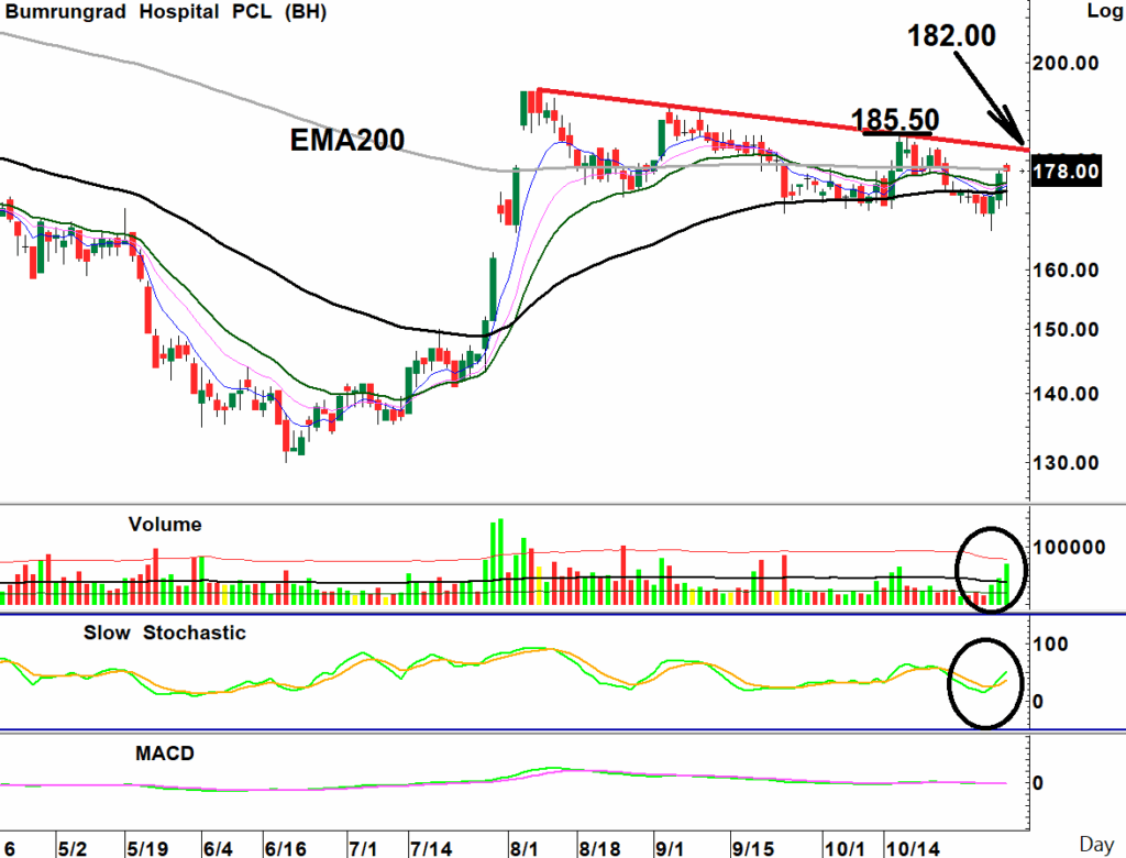 สถานะซื้อเพิ่ม: ราคาหุ้นกลับตัวขึ้นมาทดสอบแนว EMA200วัน พร้อมปริมาณการซื้อขายหนาแน่น ขณะที่เกิดสัญญาณซื้อจาก Stochastic รอบใหม่ในโซนต่ำและ MACD กลับมาชี้ตัด Signal ขึ้น มีโอกาสฟื้นขึ้นทดสอบ Downtrend Line เป็นจังหวะซื้อเก็งกำไร