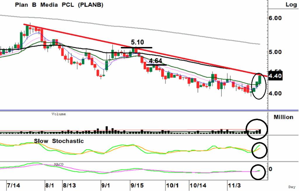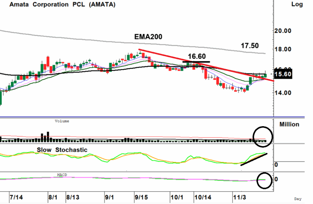 สถานะเริ่มสะสม: ราคาหุ้นฟื้นทะลุแนวกด Downtrend Line ทดสอบเส้นค่าเฉลี่ย 3 เดือน พร้อมปริมาณการซื้อขายที่สูงขึ้นขณะที่เกิดสัญญาณซื้อจาก Stochastic และ MACD ชี้ตัด Signal ขึ้นได้รอบใหม่ เป็นจังหวะซื้อเก็งกำไร