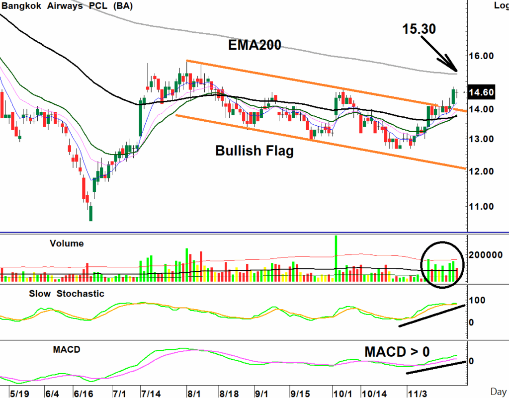 สถานะถือต่อรอขาย: ราคาหุ้นแข็งกว่าตลาดทะลุกรอบการพักฐานขาขึ้น Bullish Flag พร้อมปริมาณการซื้อขายสูงในจังหวะ Breakout ขณะที่เกิดสัญญาณซื้อจาก MACD เป็นบวกชี้ขึ้นและค่าเฉลี่ยเรียงตัวทำ Golden Cross มีโอกาสยกฐานขึ้นต่อเนื่อง เป็นจังหวะซื้อเก็งกำไร