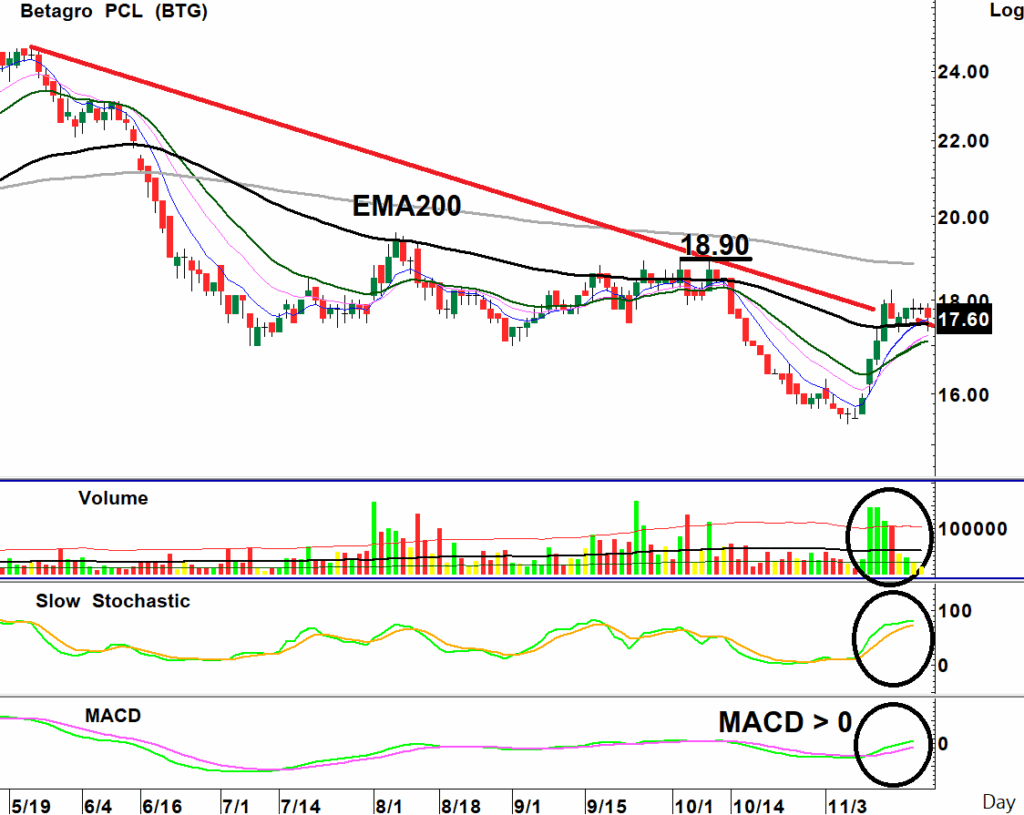 สถานะซื้อเพิ่ม: ราคาหุ้นกลับตัวขึ้นมายืนเหนือค่าเฉลี่ย 3 เดือน เริ่มทะลุแนว Downtrend Line พร้อมปริมาณการซื้อขายหนาแน่น ขณะที่เกิดสัญญาณซื้อจาก Stochastic ขึ้นได้รอบใหม่ในโซนต่ำและMACD ชี้ขึ้นพลิกกลับเป็นบวกได้รอบใหม่ เป็นจังหวะซื้อเก็งกำไร
