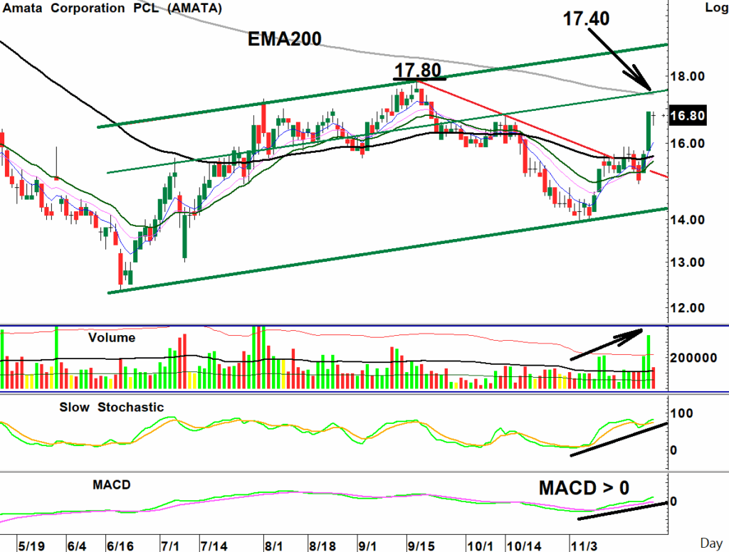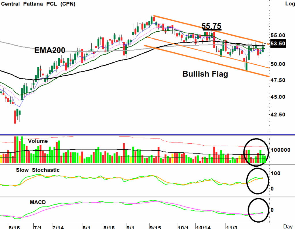 สถานะเริ่มสะสม: ราคาหุ้นกลับตัวทะลุแนวกด Downtrend Line กลับมายืนเหนือค่าเฉลี่ย 1 เดือนได้ พร้อมปริมาณการซื้อขายเพิ่มสูงขึ้นชัดเจน ขณะที่เกิดสัญญาณซื้อจาก Stochastic ยกฐานขึ้นและ MACD ชี้ตัด Signal ขึ้นมีแนวโน้มเป็นบวก เป็นจังหวะซื้อเก็งกำไร