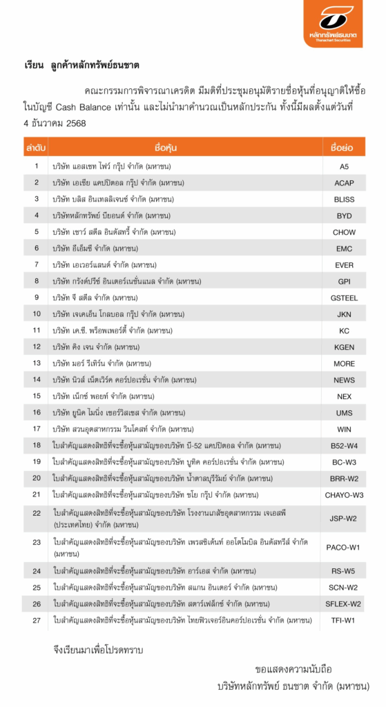 Wealth 3 Dec 2025, 15:44 ประกาศรายชื่อหลักทรัพย์ที่อนุญาตให้ซื้อในบัญชี Cash balance เท่านั้น และไม่นำมาคำนวณเป็นหลักประกัน
