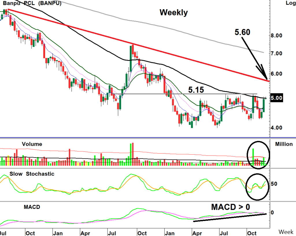 สถานะถือต่อรอขาย: ราคาหุ้นกลับตัวมายืนเหนือ EMA200วันได้ ด้วยรูปแบบ Double Bottom พร้อมปริมาณการซื้อขายสูงกว่าปกติ ขณะที่เกิดสัญญาณซื้อจาก Stochastic รอบใหม่และ MACD พลิกเป็นบวก มีโอกาสทะลุกรอบ Sideways Bottom ใน Weekly Chart