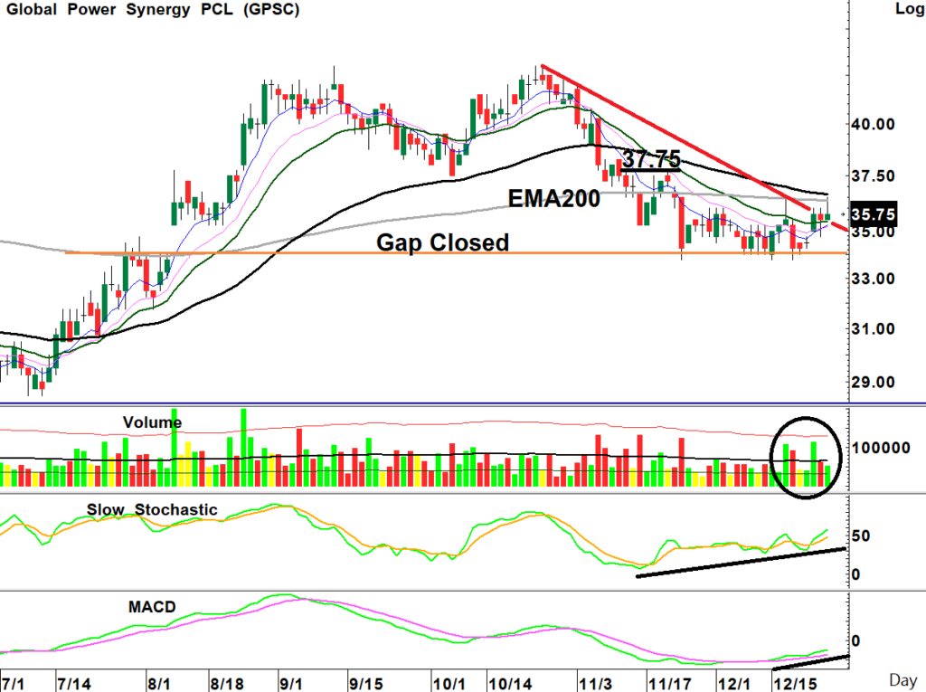 สถานะเริ่มสะสม: ราคาหุ้นกลับตัวขึ้นทะลุแนวกด Downtrend Line หลังปรับลงไปปิด Gap ที่เปิดไว้ก่อนหน้า พร้อมปริมาณการซื้อขายสูงขึ้นกว่าปกติ ขณะที่เกิดสัญญาณซื้อจาก Stochastic ขึ้นได้รอบใหม่ในโซนต่ำและ MACD กลับมาชี้ตัด Signal ขึ้น เป็นจังหวะซื้อเก็งกำไร