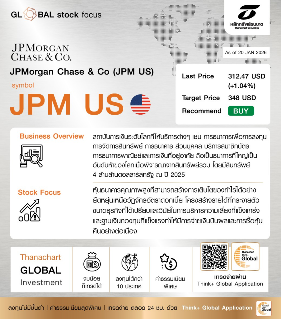 JPMorgan (JPM US) ธนาคารยักษ์ใหญ่ พื้นฐานแกร่ง เติบโตสม่ำเสมอ