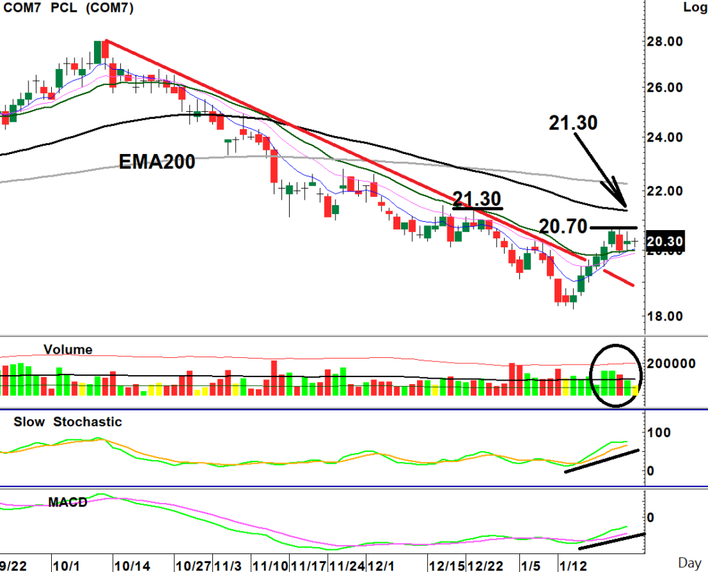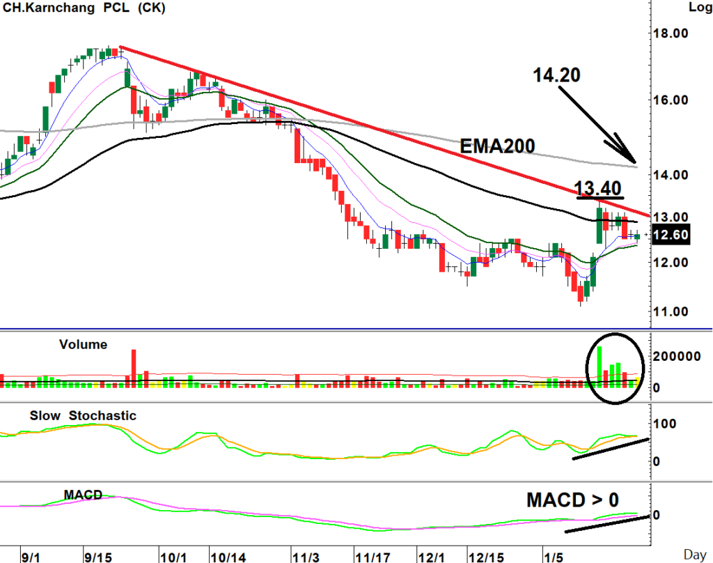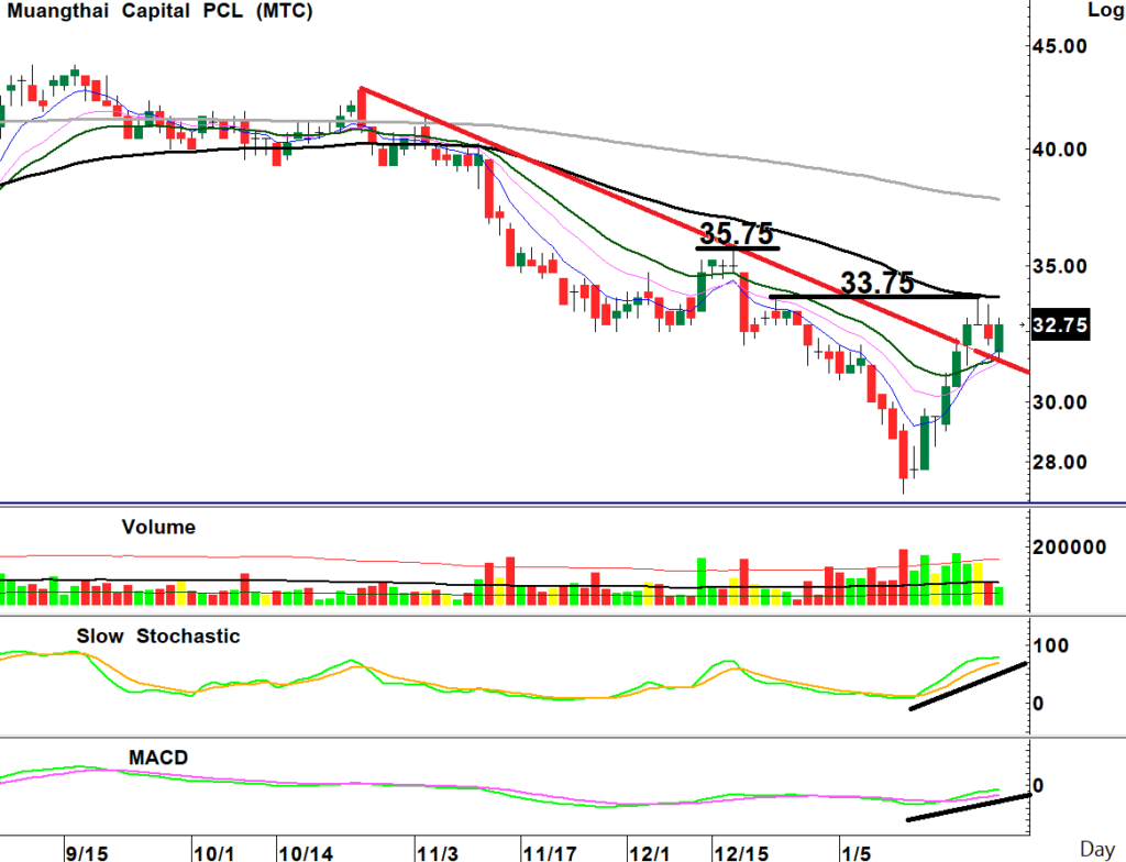 สถานะเริ่มสะสม: ราคาหุ้นกลับตัวขึ้นทะลุแนว Downtrend Line กลับมายืนเหนือค่าเฉลี่ย 1 เดือน พร้อมปริมาณการซื้อขายสูงยืนยันการ Breakout ขณะที่เกิดสัญญาณซื้อจาก Stochastic ขึ้นรอบใหม่และ MACD ชี้ขึ้นใกล้เป็นบวกสนับสนุน เป็นจังหวะซื้อเก็งกำไร