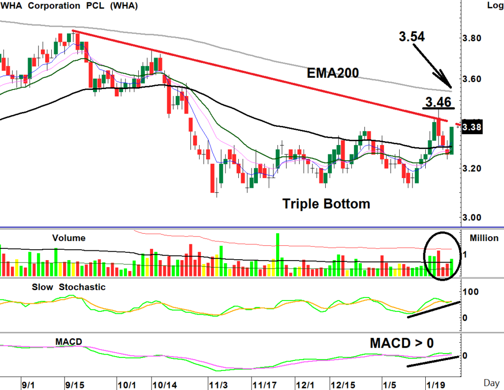 สถานะซื้อเพิ่ม: ราคาหุ้นกลับตัวขึ้นแบบ Triple Bottom ทดสอบ Downtrend Line ทำ White Marubozu พร้อมปริมาณการซื้อขายหนาแน่น ขณะที่เกิดสัญญาณซื้อจาก MACD พลิกกลับเป็นบวกได้และค่าเฉลี่ยเริ่มตัดกันทำ Golden Cross เป็นจังหวะซื้อเก็งกำไร