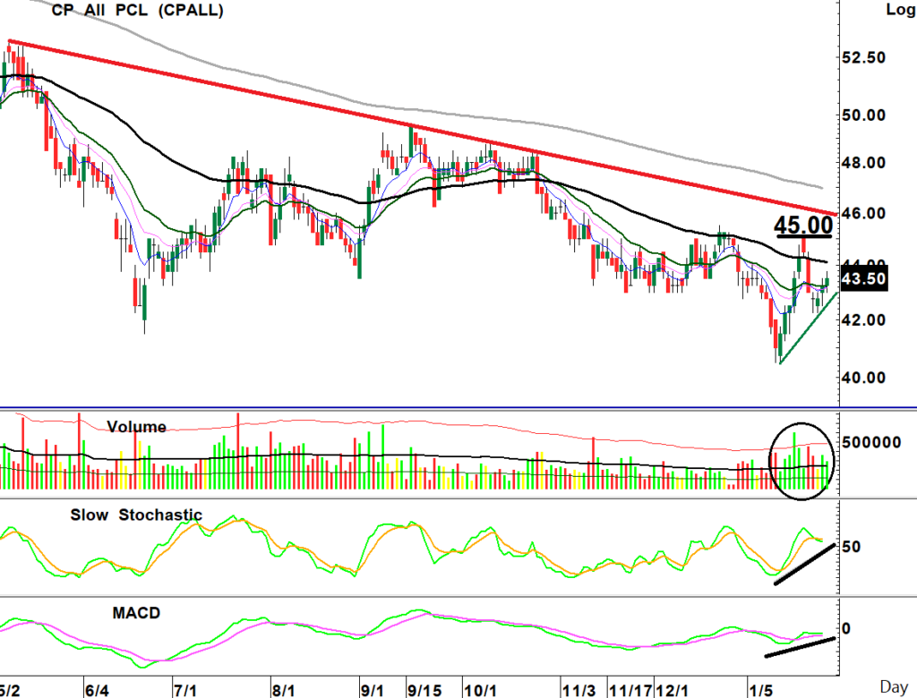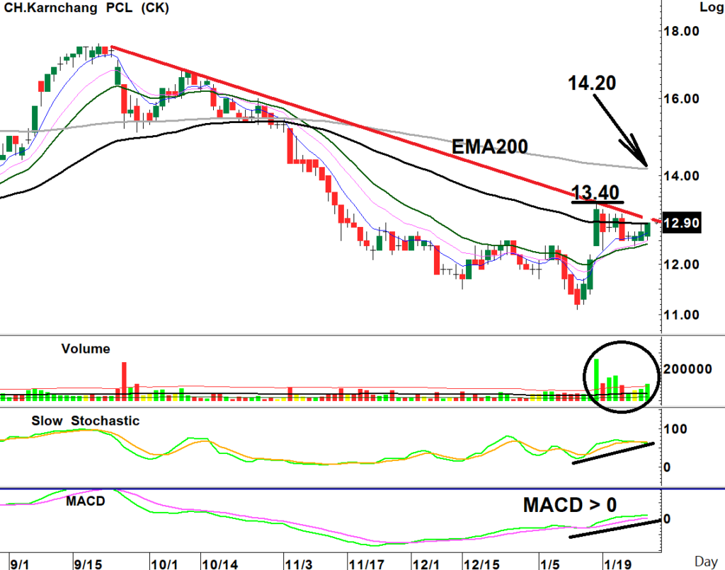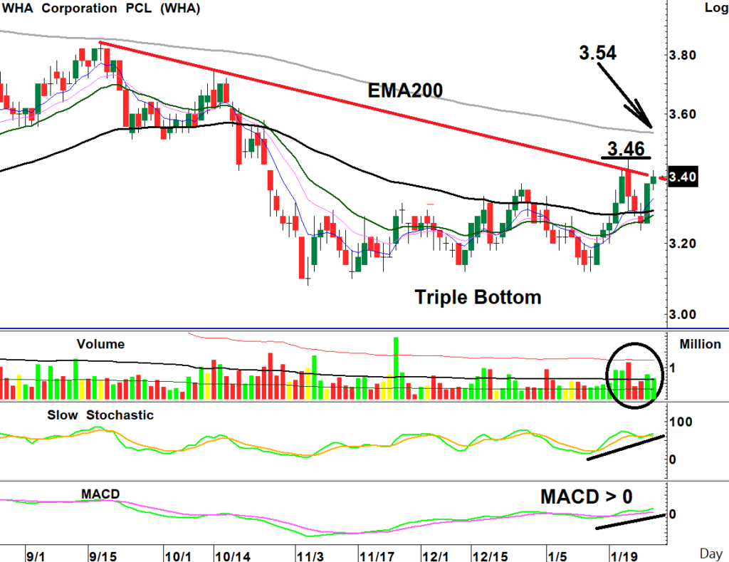 สถานะซื้อเพิ่ม: ราคาหุ้นกลับตัวขึ้นทะลุแนวกด Downtrend Line ระยะกลางได้ ด้วยรูปแบบ Triple Bottom พร้อมปริมาณการซื้อขายหนาแน่น ขณะที่เกิดสัญญาณซื้อจาก MACD พลิกกลับเป็นบวกได้และค่าเฉลี่ยเริ่มตัดกันทำ Golden Cross เป็นจังหวะซื้อเก็งกำไร