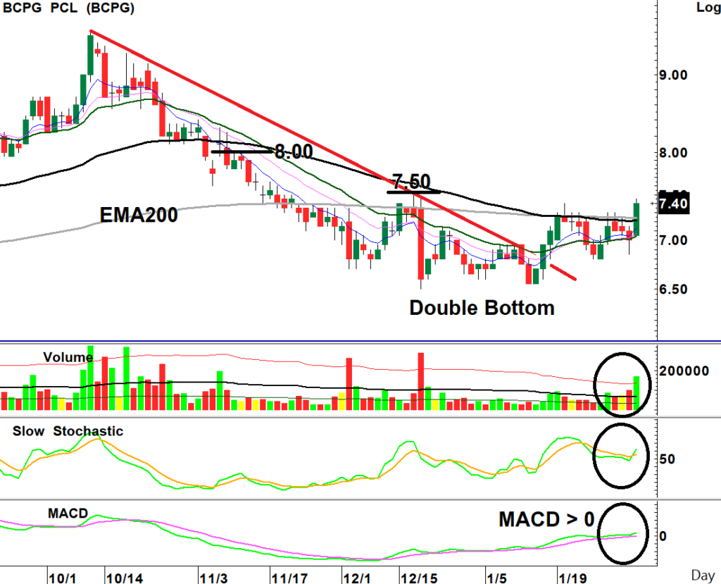สถานะซื้อเพิ่ม: ราคาหุ้นกลับตัวขึ้นทะลุแนวกด Downtrend Line ยืนเหนือ EMA200วัน ด้วยรูปแบบ Double Bottom พร้อมปริมาณการซื้อขายสูงขึ้นกว่าปกติ ขณะที่เกิดสัญญาณซื้อจาก MACD พลิกกลับเป็นบวกรอบใหม่สนับสนุนการกลับตัว เป็นจังหวะซื้อเก็งกำไร