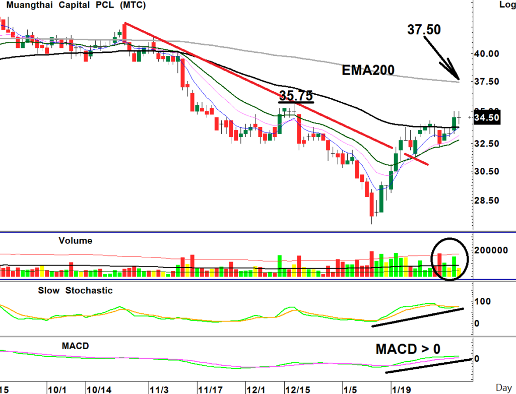 สถานะซื้อเพิ่ม: ราคาหุ้นยกฐานขึ้นมายืนเหนือค่าเฉลี่ย 3 เดือน หลังทะลุแนวกด Downtrend Line ขึ้นมาได้ก่อนหน้า พร้อมปริมาณการซื้อขายหนาแน่น ขณะที่เกิดสัญญาณซื้อจาก MACD พลิกกลับเป็นบวกรอบใหม่และค่าเฉลี่ยเรียงตัวทำ Golden Cross เป็นจังหวะซื้อเก็งกำไร