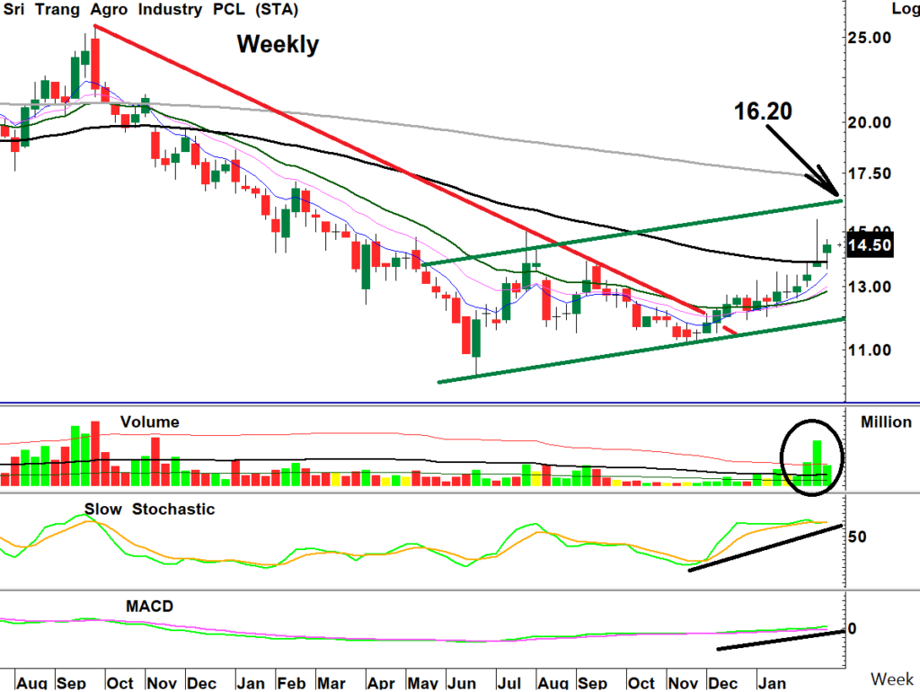 สถานะถือต่อรอขาย: ราคาหุ้นยกฐานขึ้นทะลุ Downtrend Line ใน Weekly พร้อมปริมาณการซื้อขายสูงยืนยันการกลับตัวรอบใหม่ ขณะที่เกิดสัญญาณซื้อจาก MACD เป็นบวกยกฐานขึ้นและค่าเฉลี่ยเรียงตัวทำ Golden Cross ขึ้นได้รอบใหม่ เป็นจังหวะซื้อเก็งกำไร