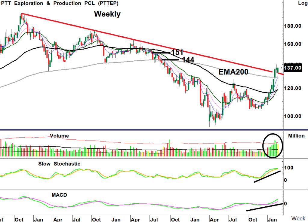 สถานะถือต่อรอขาย: ราคาหุ้นยกฐานขึ้นทะลุ Downtrend Line ใน Weekly พร้อมปริมาณการซื้อขายสูงยืนยันการกลับตัวรอบใหม่ ขณะที่เกิดสัญญาณซื้อจาก MACD เป็นบวกยกฐานขึ้นและค่าเฉลี่ยเรียงตัวทำ Golden Cross ขึ้นได้รอบใหม่ เป็นจังหวะซื้อเก็งกำไร