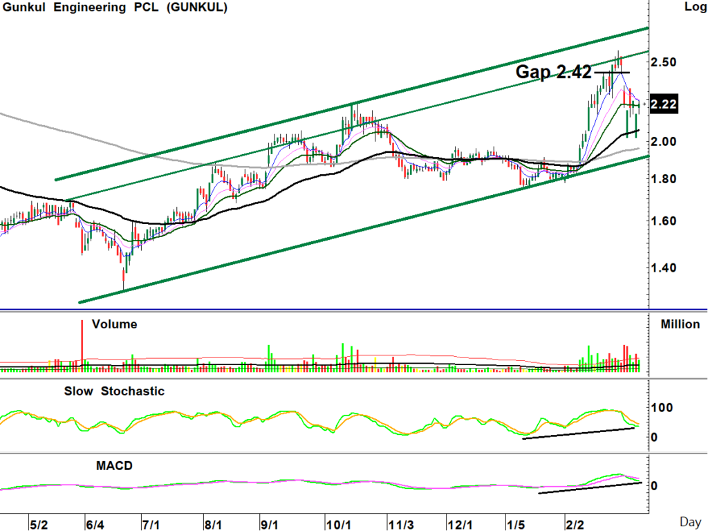 สถานะถือต่อรอขาย: ราคาหุ้นกลับตัวขึ้นจากแนว EMA200วัน หลังพักตัวเพื่อคลาย Overbought ด้วยแท่งเทียน Big White พร้อมปริมาณการซื้อขายหนาแน่น ขณะที่ MACD เป็นบวกยกฐานขึ้นและค่าเฉลี่ยยังเรียงตัวยืนยันแนวโน้ม มองพักตัวเพื่อขึ้นต่อ เป็นจังหวะซื้อเก็งกำไร