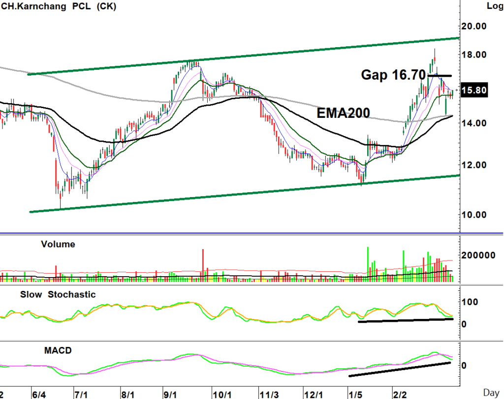 สถานะถือต่อรอขาย: ราคาหุ้นกลับตัวขึ้นจากแนว EMA200วัน หลังพักตัวเพื่อคลาย Overbought พร้อมปริมาณการซื้อขายลดลงช่วงพักตัว ขณะที่ MACD เป็นบวกยกฐานขึ้นและค่าเฉลี่ยยังเรียงตัวยืนยันแนวโน้มขึ้น มองพักตัวเพื่อขึ้นต่อ เป็นจังหวะซื้อเก็งกำไร