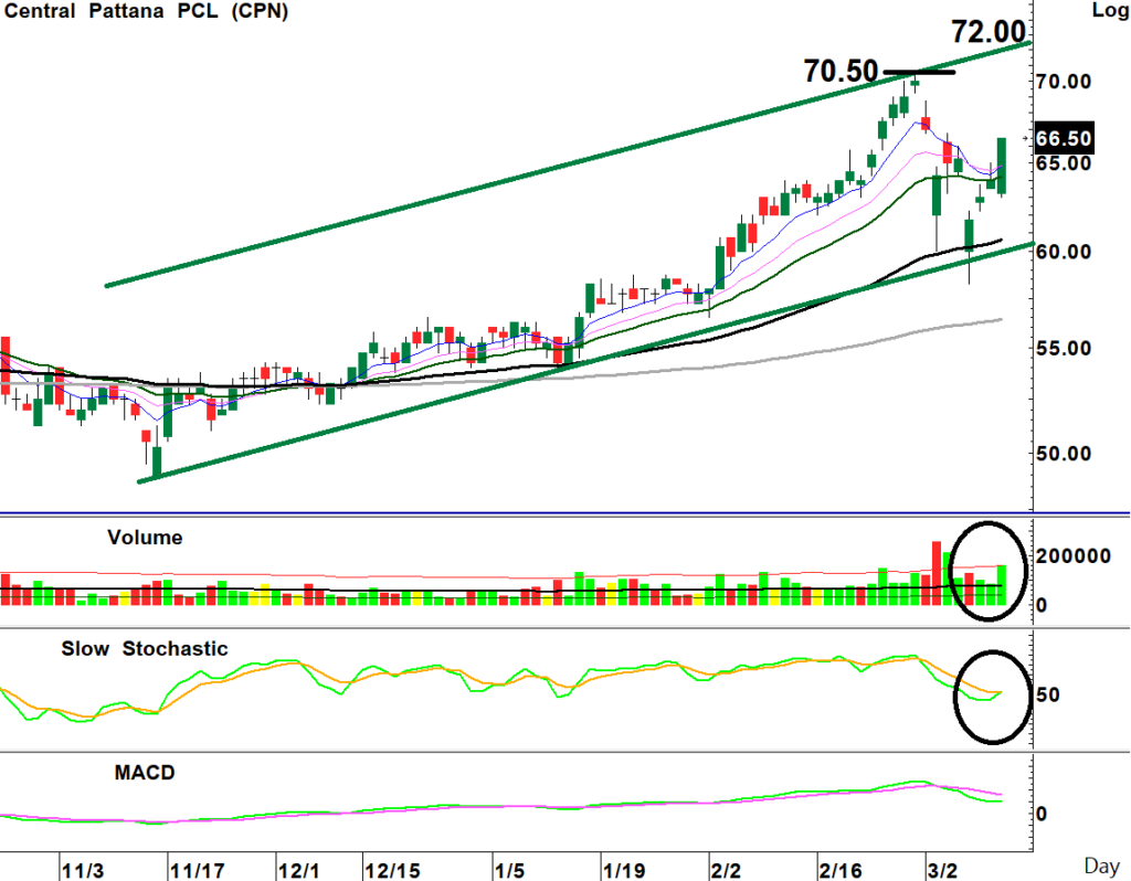 สถานะถือต่อรอขาย: ราคาหุ้นกลับตัวขึ้นจากแนว Uptrend Lineและค่าเฉลี่ย 3 เดือน ด้วยแท่งเทียน Three White Soldiers พร้อมปริมาณการซื้อขายสูงขึ้น ขณะที่เกิดสัญญาณซื้อจาก Stochastic รอบใหม่และค่าเฉลี่ยเรียงตัวยืนยันแนวโน้ม เป็นจังหวะซื้อเก็งกำไร
