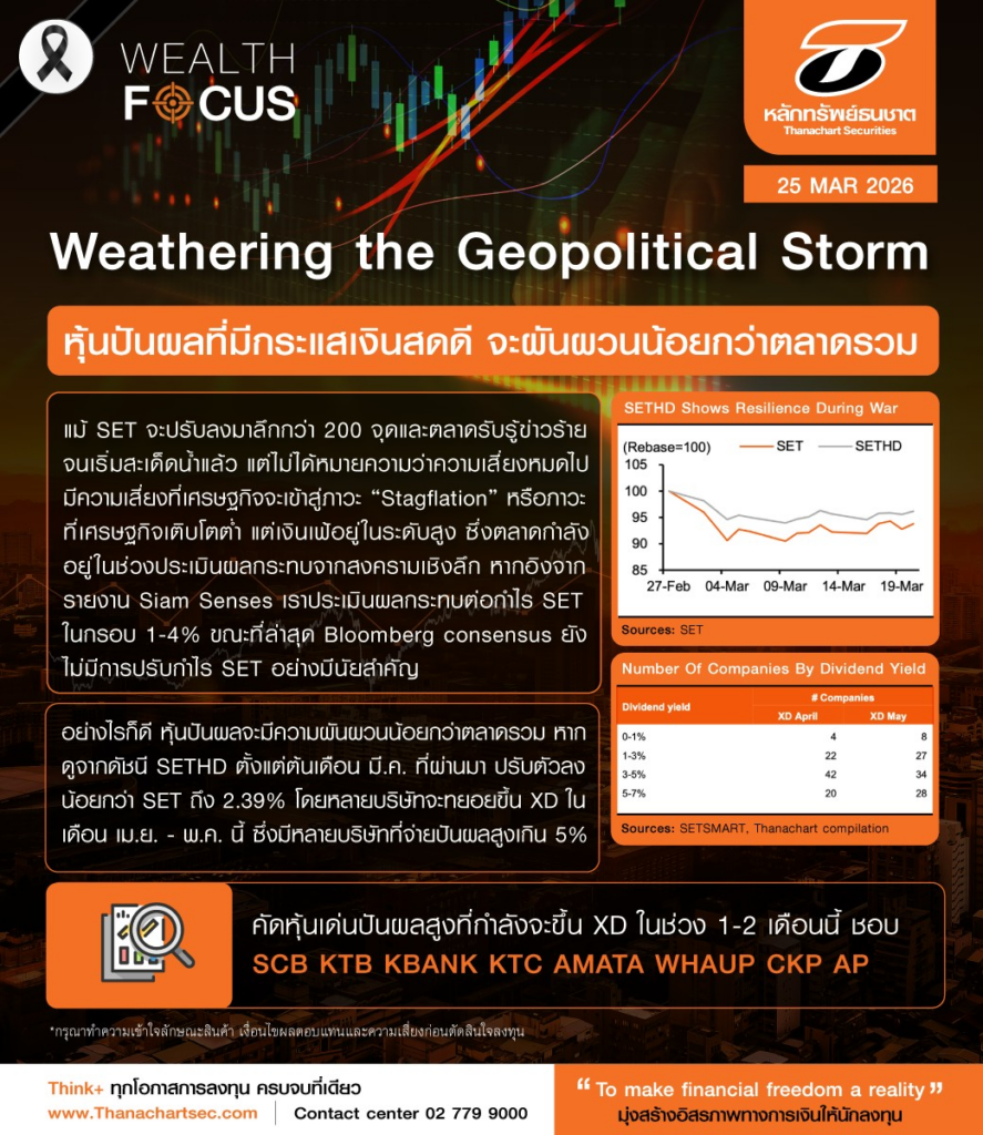 Strategy 25 Mar 2026, 10:23 คัดหุ้นเด่นปันผลสูงที่กำลังจะขึ้น XD ในอีก 1-2 เดือนนี้ อ่านรายละเอียดฉบับเต็มได้ที่ รายงาน Pathumwan Corner วันนี้