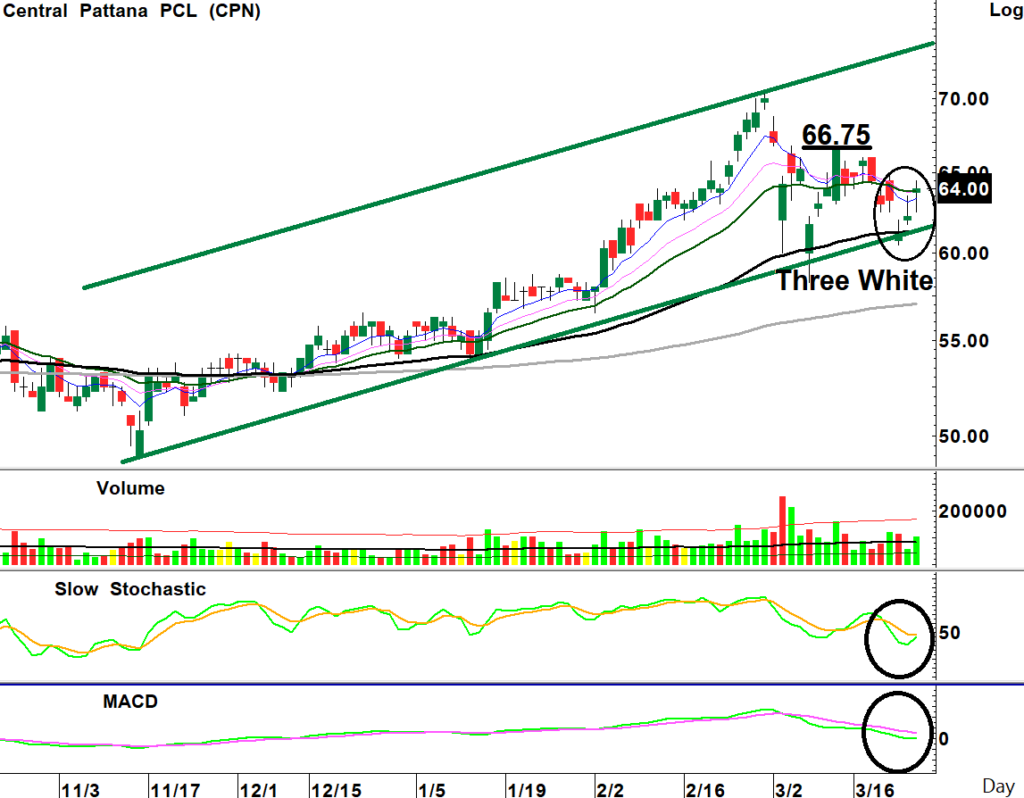 สถานะซื้อเพิ่ม: ราคาหุ้นกลับตัวขึ้นจากแนวรับ Uptrend Line และแนวค่าเฉลี่ย 3 เดือน ทำแท่งเทียน Three White Soldiers พร้อมปริมาณการซื้อขายกลับมาสูงขึ้น ขณะที่เกิดสัญญาณซื้อจาก Stochastic ขึ้นรอบใหม่ในโซนต่ำสนับสนุน เป็นจังหวะซื้อเก็งกำไร