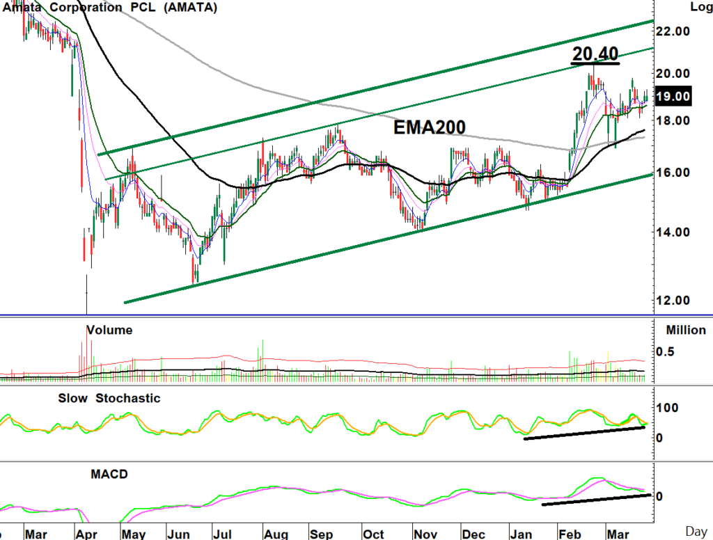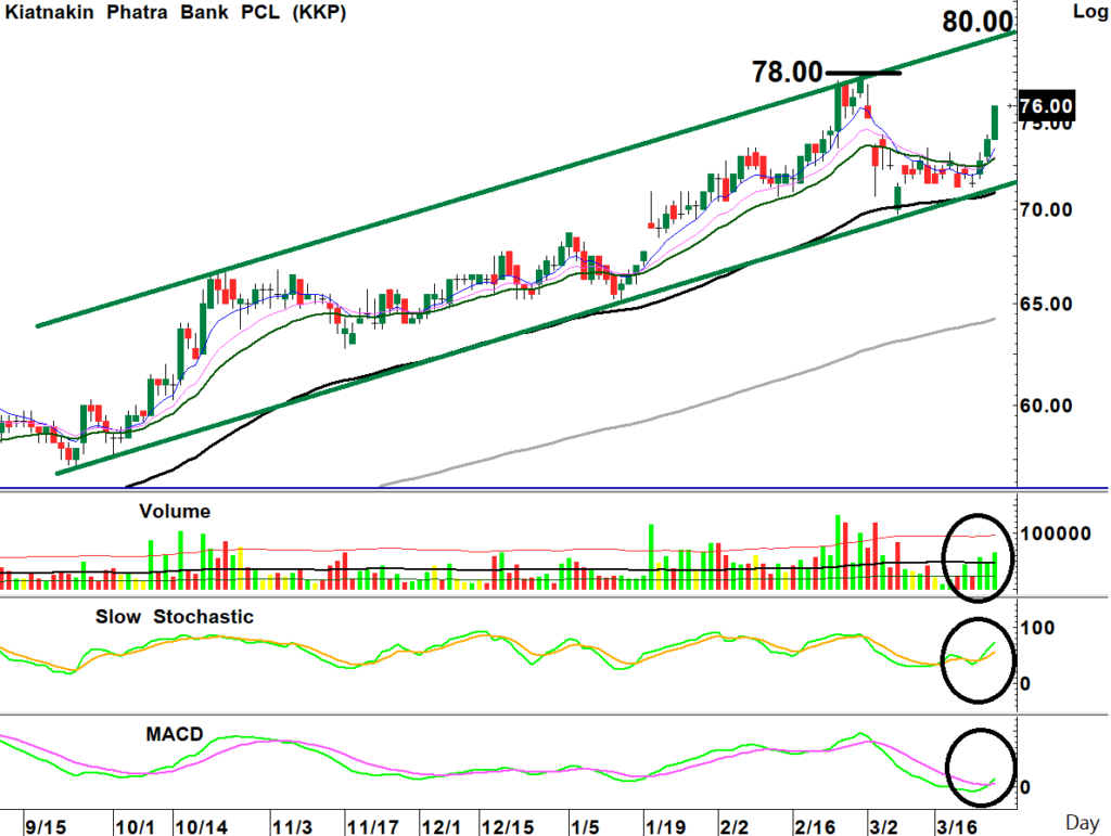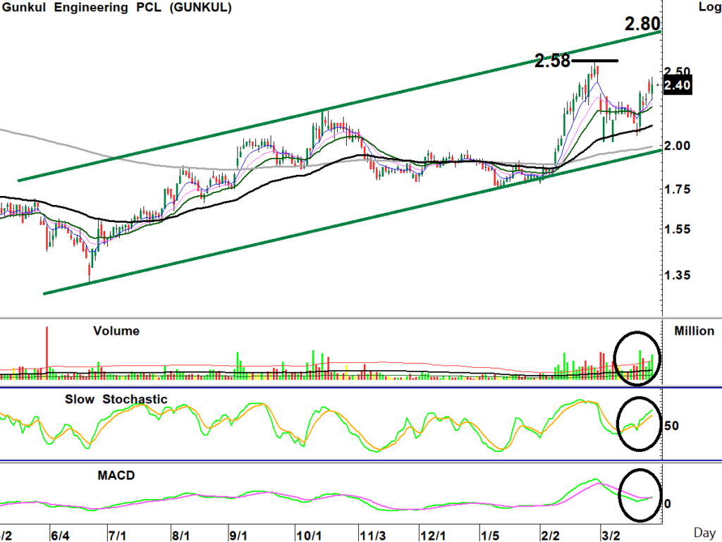 สถานะถือต่อรอขาย: ราคาหุ้นกลับตัวขึ้นจากแนวรับ Uptrend Line และแนวค่าเฉลี่ย 3 เดือน ด้วยแท่งเทียน Three White Soldiers พร้อมปริมาณการซื้อขายสูงขึ้น ขณะที่เกิดสัญญาณซื้อจาก Stochastic รอบใหม่ในโซนต่ำและ MACD พลิกเป็นบวก เป็นจังหวะซื้อเก็งกำไร