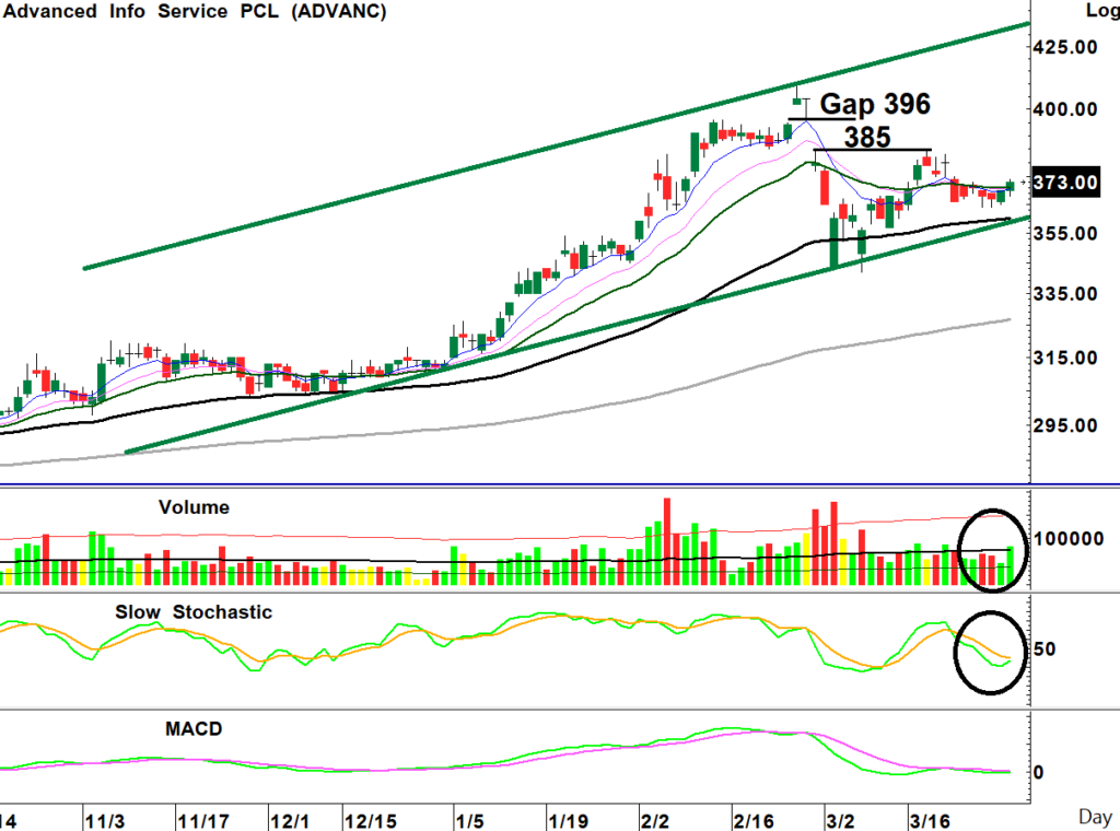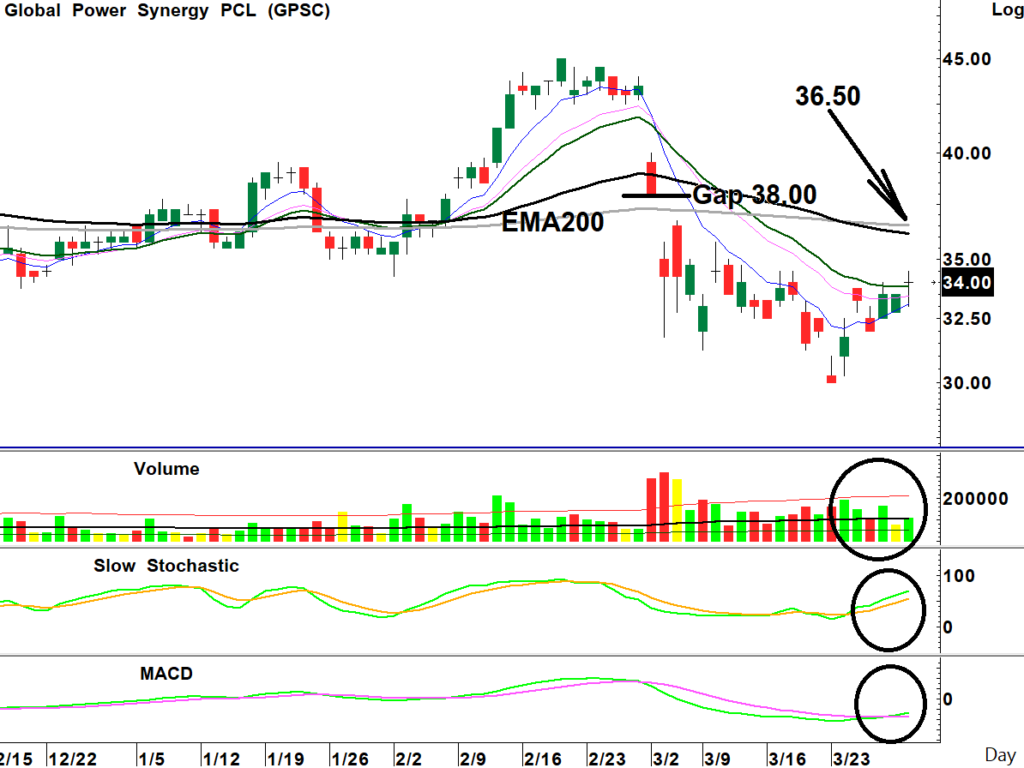 สถานะซื้อเพิ่ม: ราคาหุ้นฟื้นตัวยกฐานขึ้นหลังพักตัวในกรอบ Uptrend ไม่หลุดแนวค่าเฉลี่ย 3 เดือน พร้อมปริมาณการซื้อขายสูงขึ้นกว่าปกติ ขณะที่เกิดสัญญาณซื้อจาก Stochastic ขึ้นได้รอบใหม่และค่าเฉลี่ยทำ Golden Cross รอบใหม่ มีโอกาสขึ้นต่อตามกรอบ เป็นจังหวะซื้อเก็งกำไร