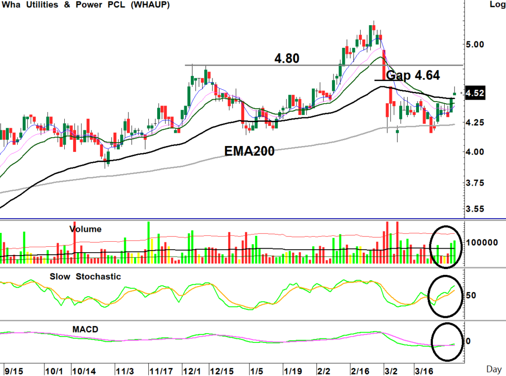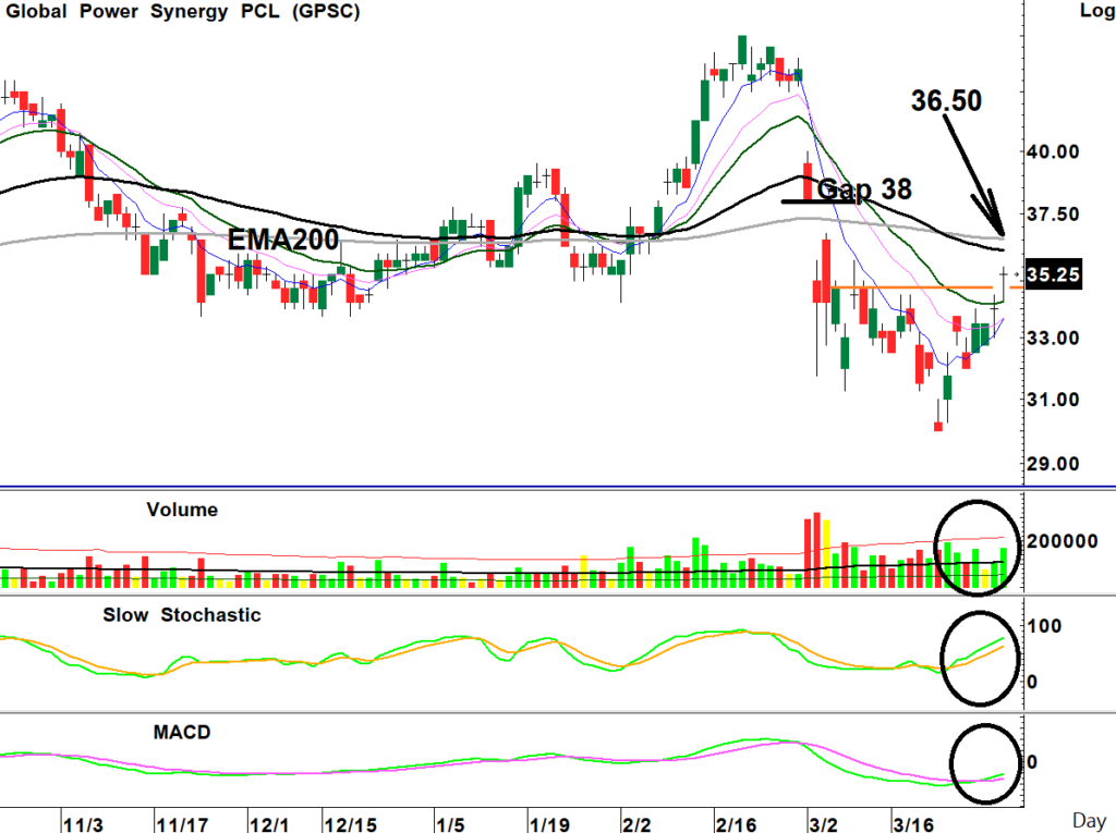 สถานะเริ่มสะสม: ราคาหุ้นฟื้นขึ้นจากแนว EMA200วัน ทะลุกรอบ Sideway-Bottom กลับมายืนเหนือแนวค่าเฉลี่ย 3 เดือนได้ พร้อมปริมาณการซื้อขายหนาแน่น ขณะที่เกิดสัญญาณซื้อจาก Stochastic ขึ้นได้รอบใหม่และ MACD ตัด Signal ขึ้นใกล้พลิกเป็นบวก เป็นจังหวะซื้อเก็งกำไร