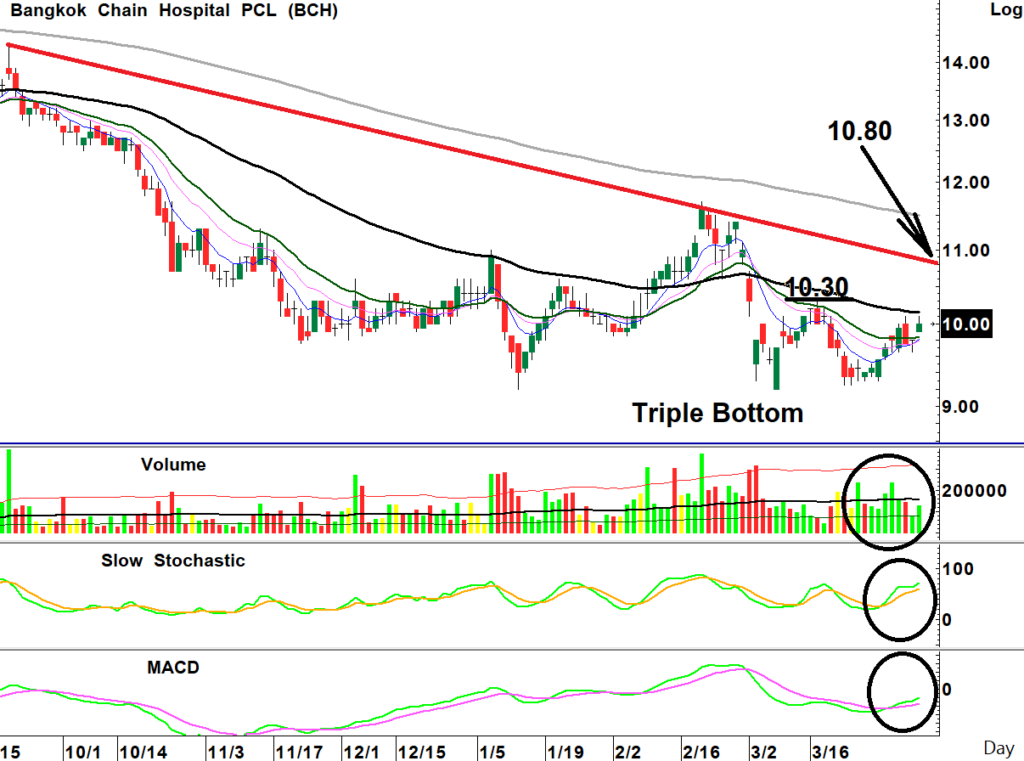 สถานะเริ่มสะสม: ราคาหุ้นกลับตัวขึ้นด้วยรูปแบบ Triple Bottom กลับมายืนเหนือแนวค่าเฉลี่ย 1 เดือนได้ พร้อมปริมาณการซื้อขายหนาแน่น ขณะที่เกิดสัญญาณซื้อจาก Stochastic ขึ้นได้รอบใหม่และ MACD กลับมาชี้ตัด Signal ขึ้นจากโซนต่ำ เป็นจังหวะซื้อเก็งกำไร