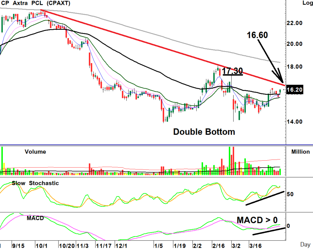 สถานะซื้อเพิ่ม: ราคาหุ้นฟื้นขึ้นด้วยรูปแบบ Double Bottom ยกฐานทำ Higher-Low กลับมายืนเหนือแนวค่าเฉลี่ย 3 เดือนได้ พร้อมปริมาณการซื้อขายหนาแน่น ขณะที่เกิดสัญญาณซื้อจาก Stochastic ขึ้นได้รอบใหม่และ MACD พลิกกลับเป็นบวกได้สนับสนุน เป็นจังหวะซื้อเก็งกำไร