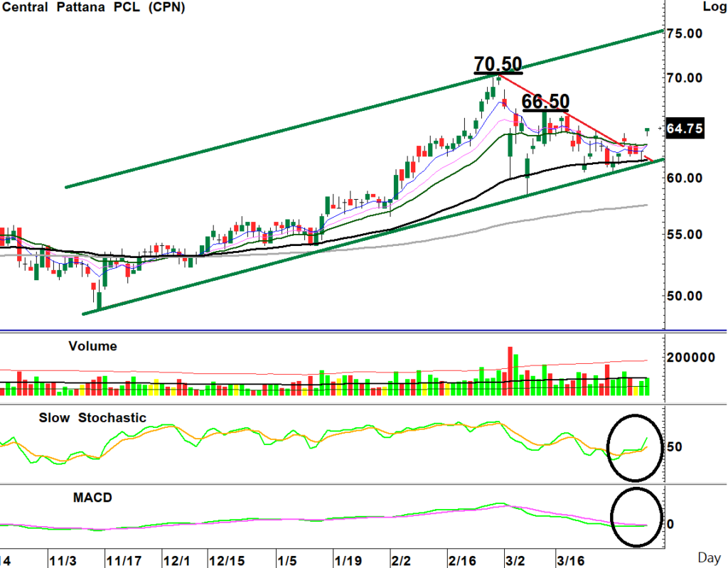 สถานะซื้อเพิ่ม: ราคาหุ้นกลับตัวขึ้นจากแนวรับ Uptrend Line หลังพักตัวไม่หลุดแนวค่าเฉลี่ย 3 เดือน พร้อมปริมาณการซื้อขายลดลงจังหวะพักตัวขณะที่เกิดสัญญาณซื้อจาก Stochastic ขึ้นได้รอบใหม่และ MACD ฟื้นมาชี้ตัด Signal ขึ้น มีโอกาสยกฐานขึ้นได้ตามกรอบ เป็นจังหวะซื้อเก็งกำไร