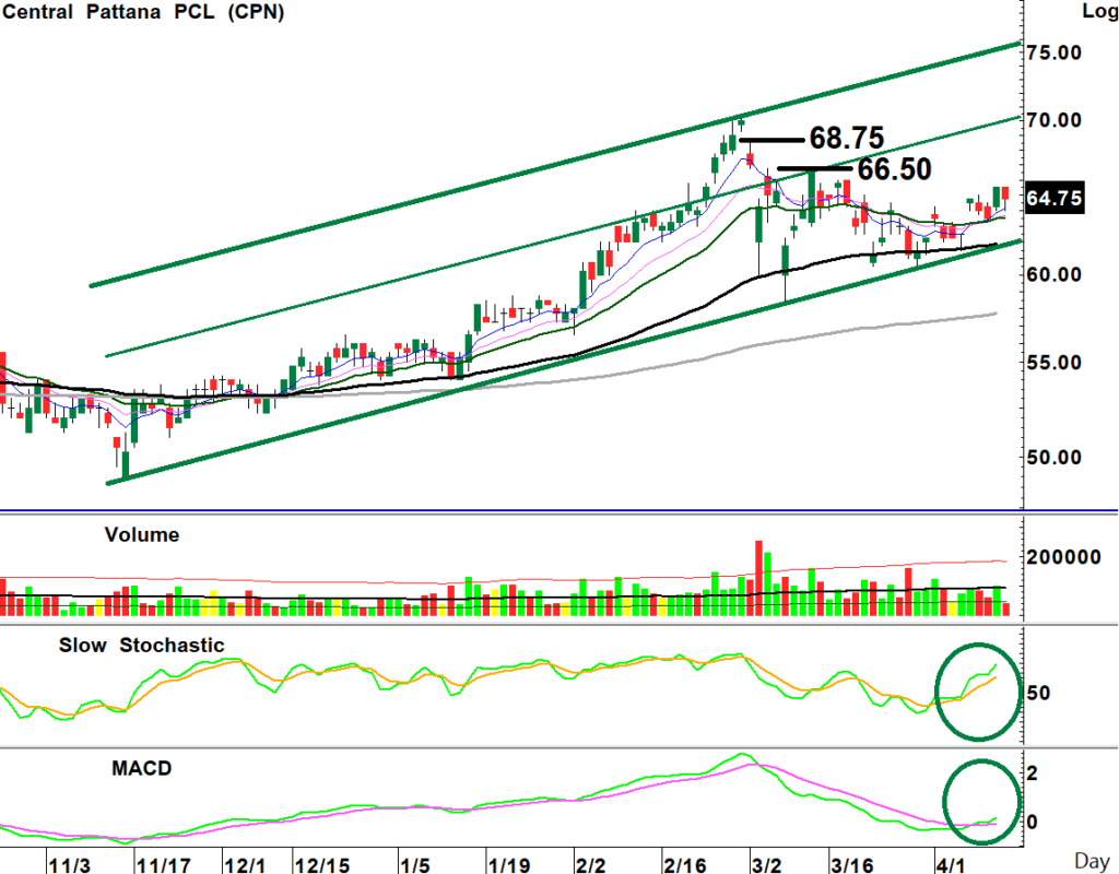 สถานะถือต่อรอขาย: ราคาหุ้นกลับตัวขึ้นจากแนวรับ Uptrend Line หลังพักตัวไม่หลุดค่าเฉลี่ย 3 เดือน พร้อมปริมาณการซื้อขายหนาแน่น ขณะที่เกิดสัญญาณซื้อจาก MACD พลิกกลับเป็นบวกได้อีกครั้งและค่าเฉลี่ยเรียงตัวทำGolden Cross ยืนยันแนวโน้ม เป็นจังหวะซื้อเก็งกำไร