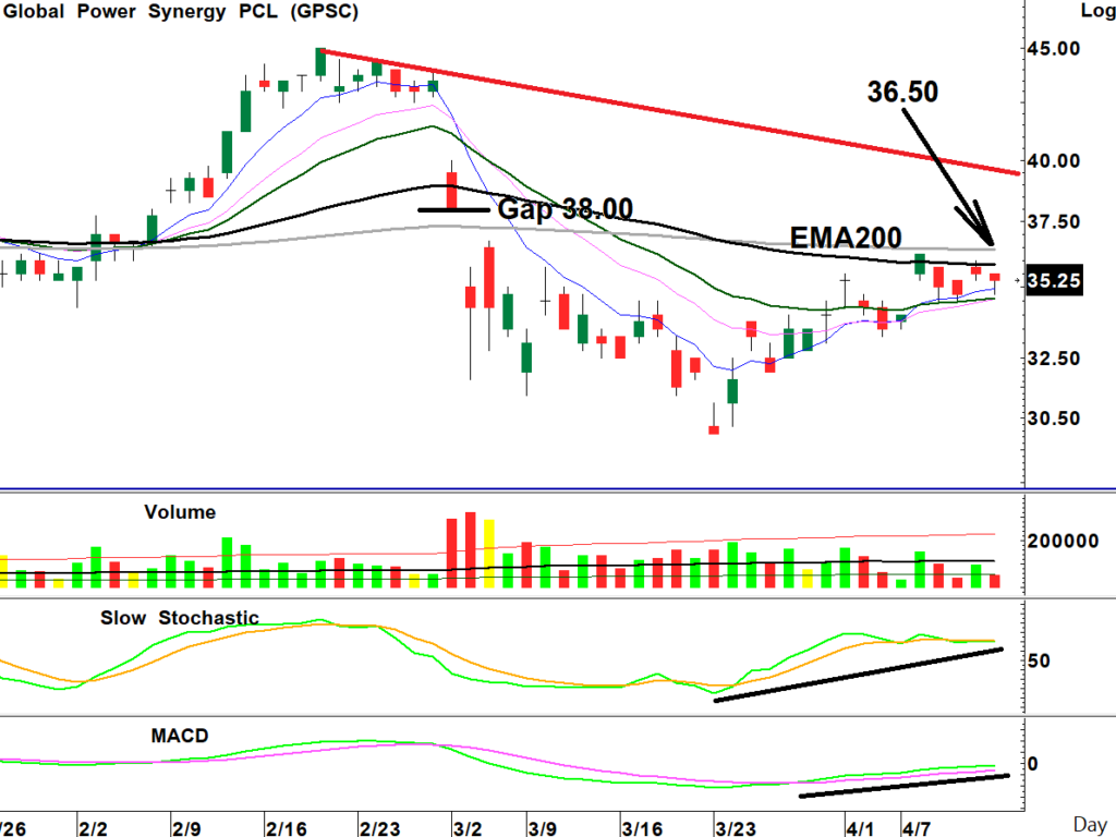 สถานะซื้อเพิ่ม: ราคาหุ้นฟื้นตัวยกฐานขึ้นทำ Higher-Low กลับมายืนเหนือแนว EMA200วันได้ พร้อมปริมาณการซื้อขายหนาแน่น ขณะที่เกิดสัญญาณซื้อจาก Stochastic ขึ้นได้รอบใหม่และ MACD กลับมาชี้ตัด Signal ขึ้นพลิกกลับเป็นบวกได้เป็นวันแรกสนับสนุน เป็นจังหวะซื้อเก็งกำไร