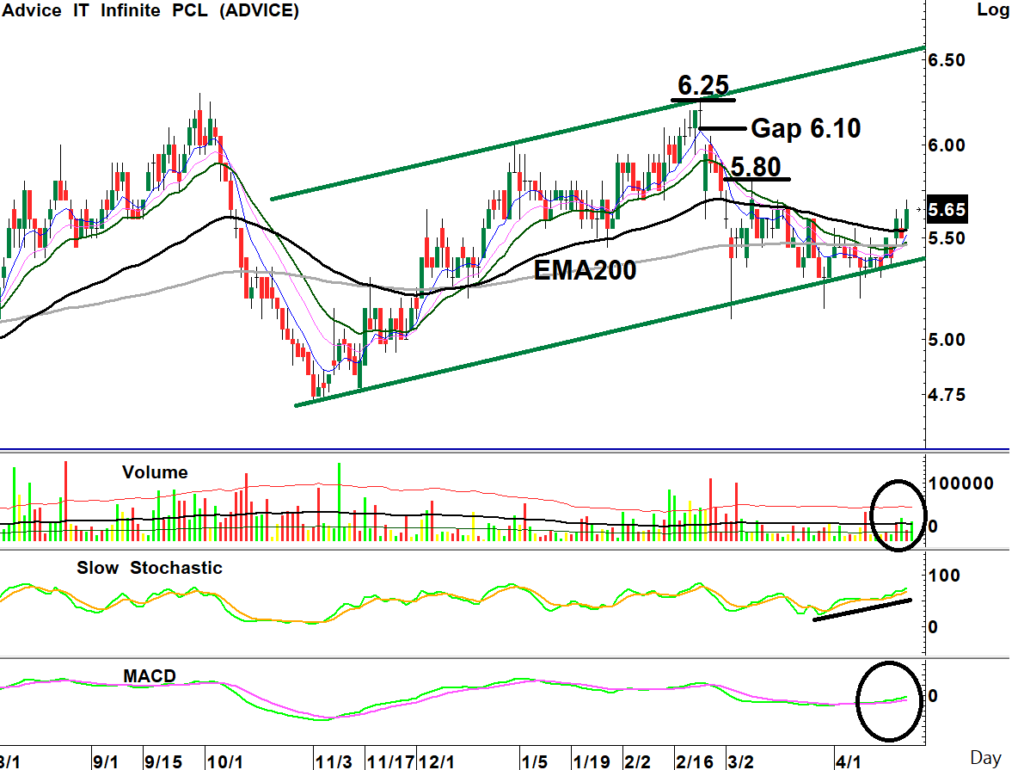 สถานะถือต่อรอขาย: ราคาหุ้นกลับตัวขึ้นจากแนว EMA200วัน กลับมาทะลุแนวกด Downtrend Line ขึ้นได้ พร้อมปริมาณการซื้อขายหนาแน่น ขณะที่เกิดสัญญาณซื้อจาก MACD เป็นบวกยกฐานขึ้นและค่าเฉลี่ยเรียงตัวยืนยันแนวโน้มขึ้น มีโอกาสยกฐานขึ้นต่อเนื่อง เป็นจังหวะซื้อเก็งกำไร