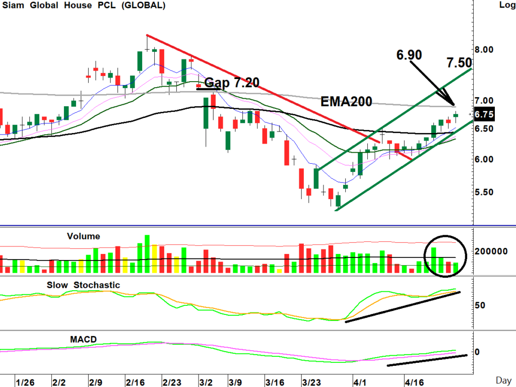สถานะเริ่มสะสม: ราคาหุ้นกลับตัวขึ้นจากแนวรับ Uptrend Line และ EMA200วัน พร้อมปริมาณการซื้อขายกลับมาสูงขึ้นอีกครั้ง ขณะที่เกิดสัญญาณซื้อจาก Stochastic ยกฐานขึ้นและ MACD ชี้ตัด Signal ขึ้นใกล้พลิกกลับเป็นบวกรอบใหม่ มีโอกาสยกฐานขึ้นได้ต่อเนื่อง เป็นจังหวะซื้อเก็งกำไร